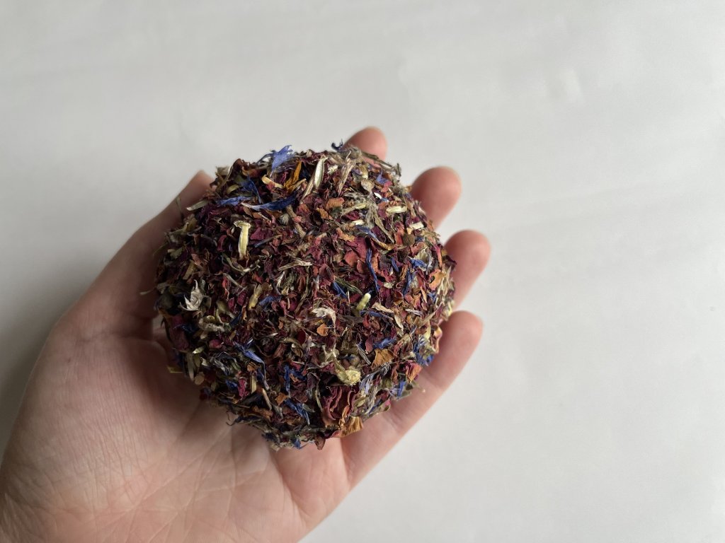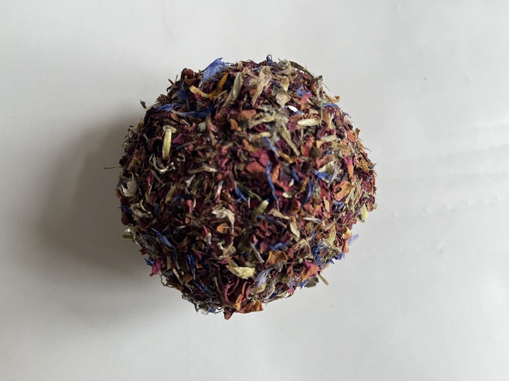 Kytičkový míček je krásná a funkční hračka pro králíčky a hlodavce. Je vyrobený ze sena a juty, obalený květy růže a chrpy a lněným semínkem. Mazlíčci si s ním mohou hrát, chroupat ho a zároveň si přirozeně obrušují zuby.