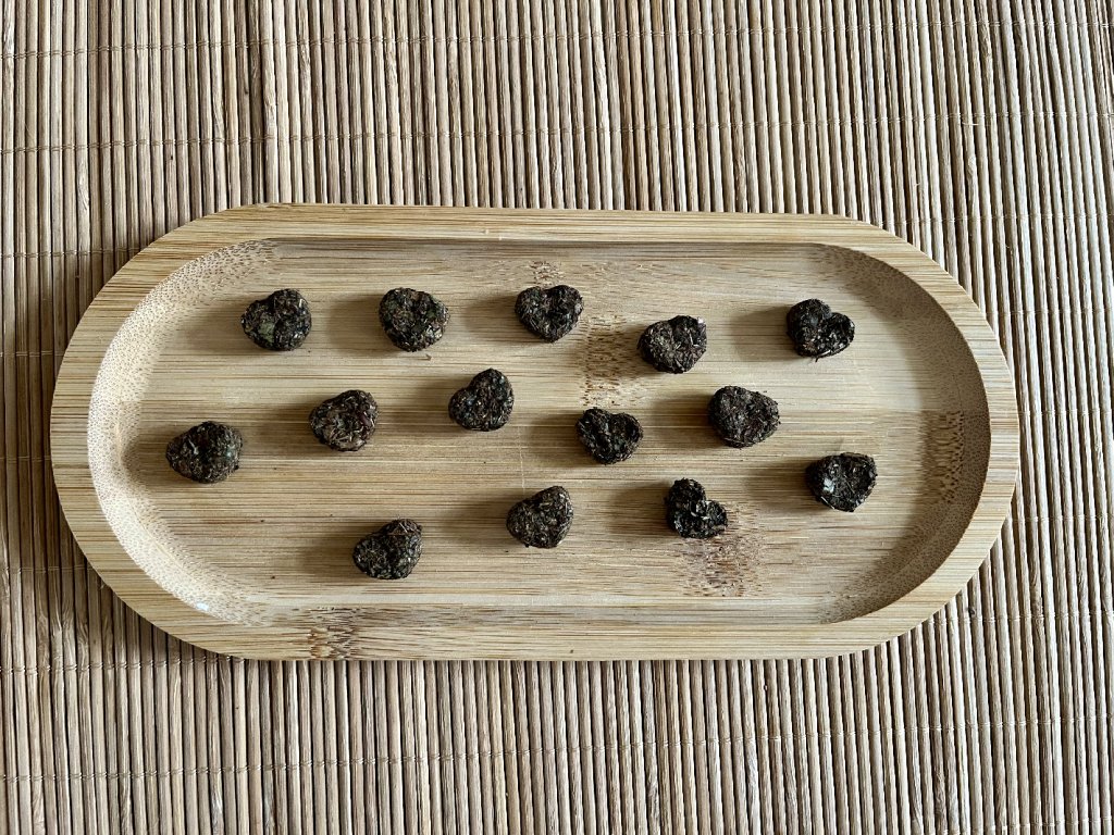 Srdíčka jsou ručně tvarovaná a šetrně sušená na nízkou teplotu, aby si suroviny zachovaly svou přirozenou kvalitu.