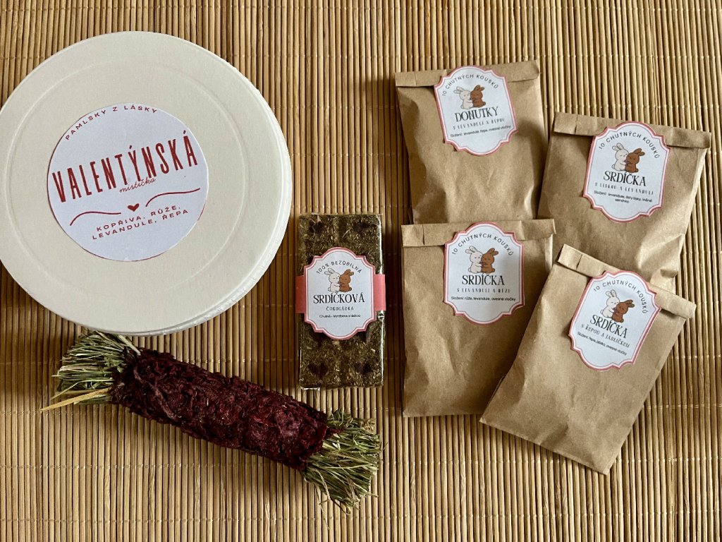 Box je sestaven tak, aby mazlíček mohl mlsat, objevovat, okusovat i obrušovat zoubky – zkrátka malý valentýnský zážitek od prvního otevření až po poslední drobek.